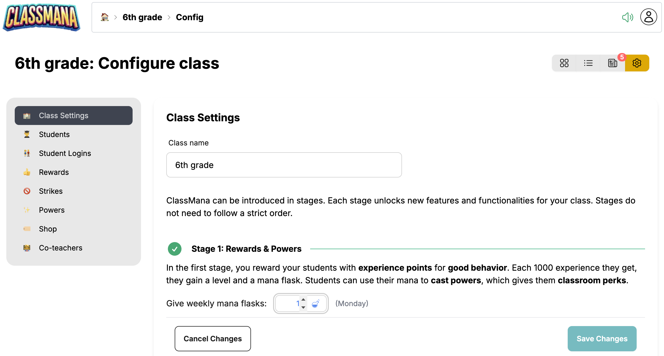 Etapa 1 je základom gamifikačného systému ClassMana. Odmeňujete študentov skúsenostnými bodmi za dobré správanie. Za každých 1000 získaných skúseností študenti postúpia o úroveň a získajú 1 manu. Študenti môžu minúť svoju manu na vyvolanie síl – špeciálnych triednych výhod a privilégií.