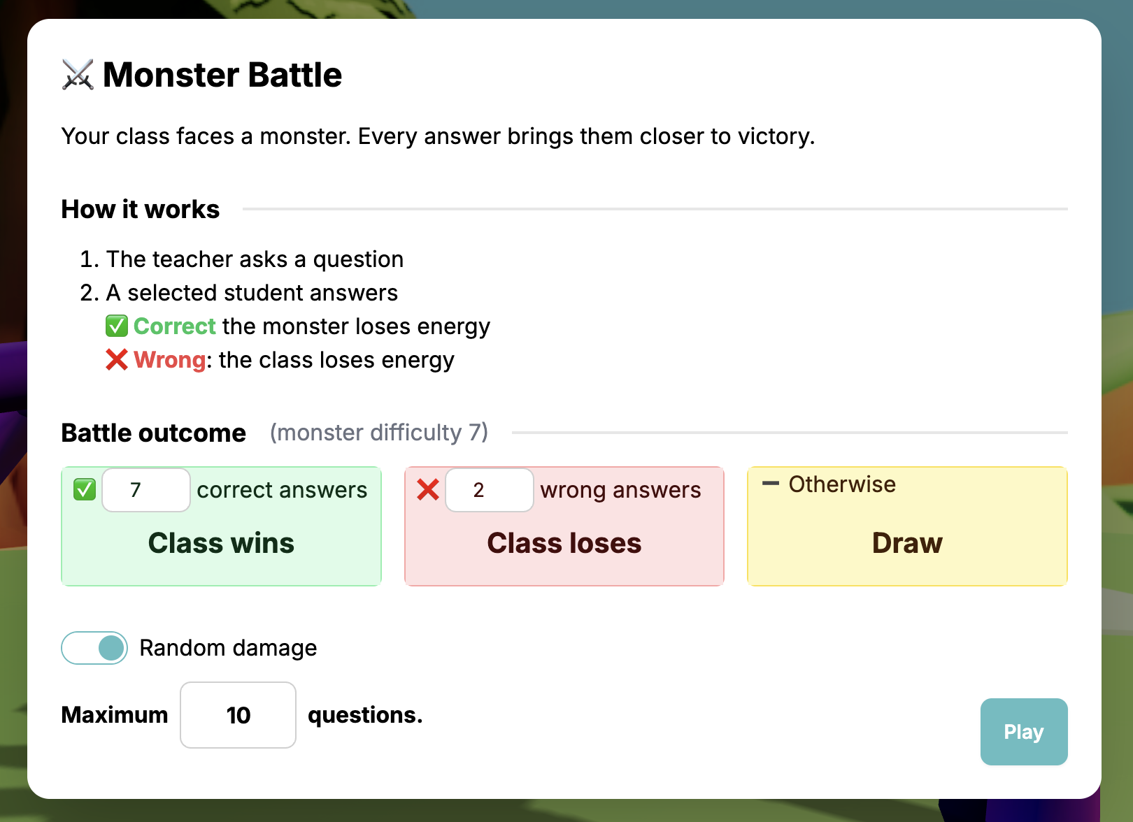 - Boj pokračuje až kým nie je príšera porazená, trieda nestratí všetku energiu, alebo nie je dosiahnutý maximálny počet otázok