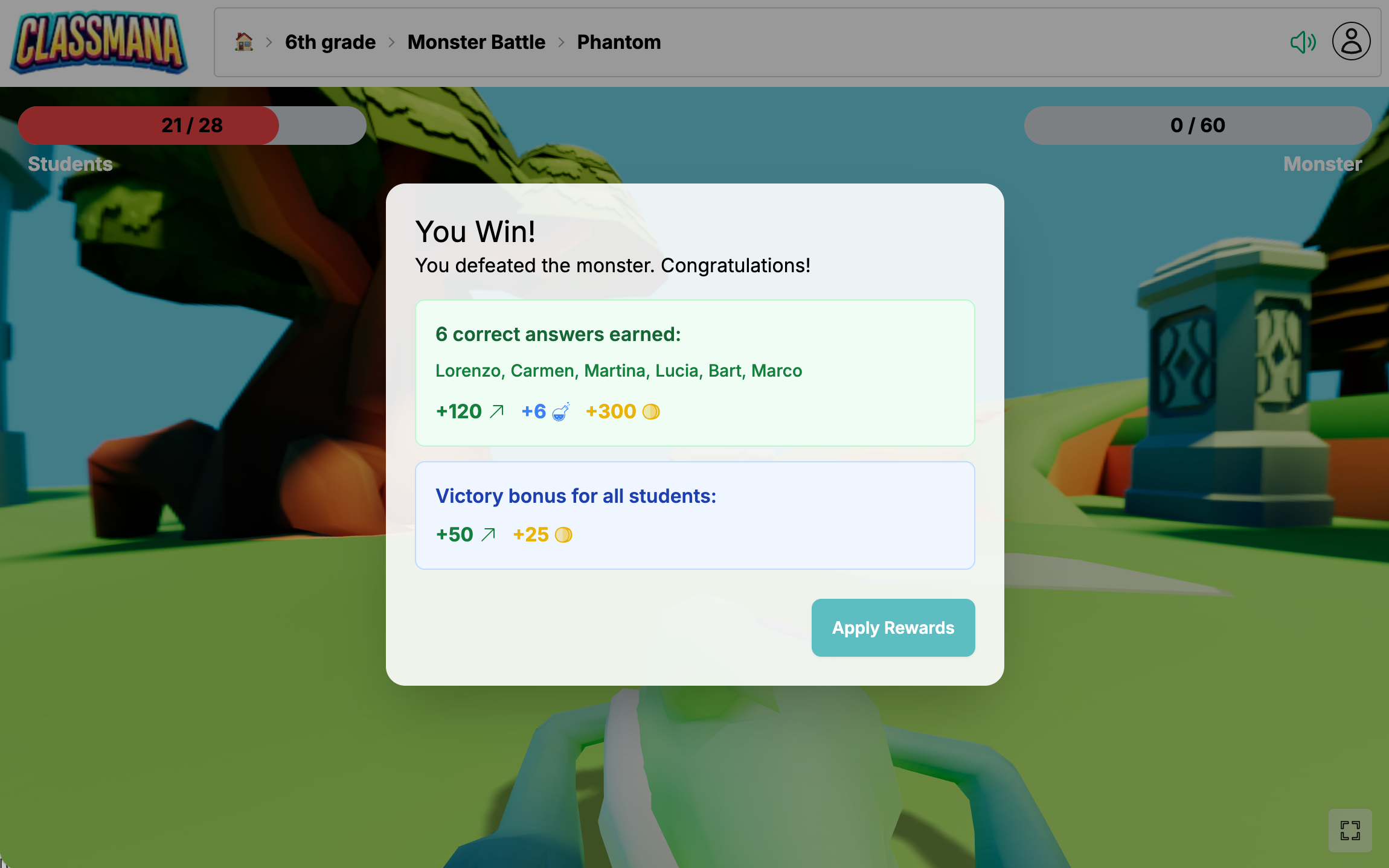 Kliknite na Aplikovať odmeny na pridanie všetkých odmien do profilov študentov. Záznamy aktivity sa vytvárajú automaticky s komentármi ako "Správna odpoveď v Boji s príšerou" alebo "Víťazný bonus v Boji s príšerou".
